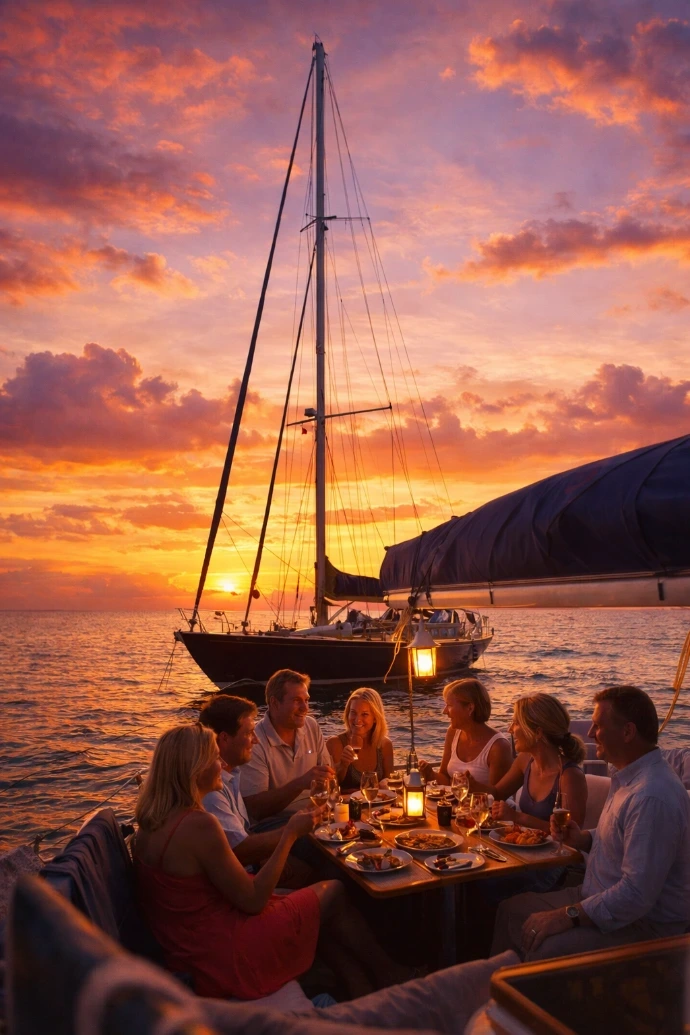 Segeln, ankern, genießen – und die Sonne im Meer versinken sehen. Ein besonderes Erlebnis für Genießer. Unser Skipper bringt Sie zu einem besonders schönen Ankerplatz. Dort genießen Sie leckere Tapas und guten spanischen Sekt und erleben den Sonnenuntergang vom Wasser aus - ein Moment, den Sie nicht vergessen werden. Wir starten gegen 20 Uhr und kommen um Mitternacht zurück in den Hafen von Alicante.